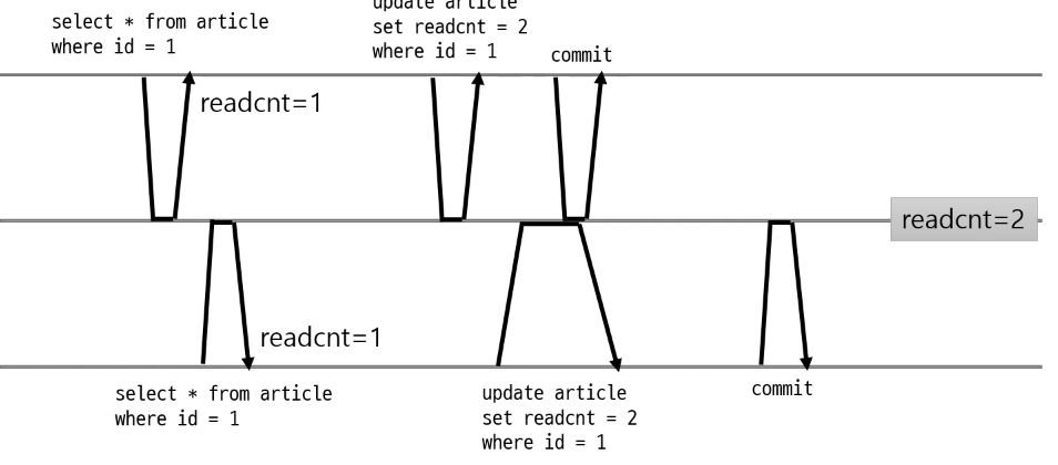 - DB가 원자적인 연산을 실행: update article set readcnt = readcnt + 1 where id = 1; 과같이 수정