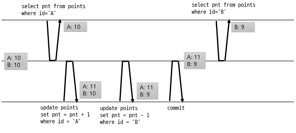 - 이미 다른 transaction이 수정을 하고 있을 경우 commit이 완료될 때끼지 대기