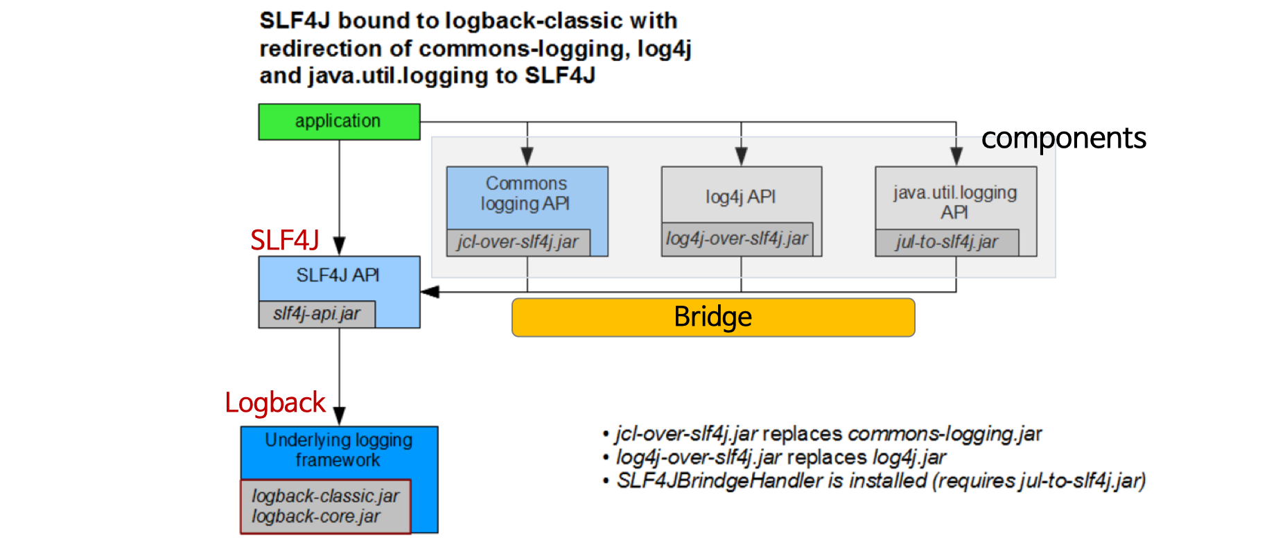 - 레거시 logging을 사용하는 프로젝트를 위해 다른 Binding과 연동해주는 하나의 어댑터