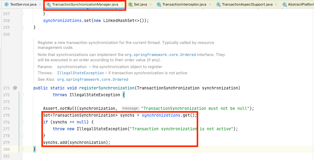 TransactionSynchronizationAdapter객체는registerSynchronization통해 thread local에 있는 Set 객체에 등록됩니다 - 해당 Thread local 변수인 synchronizations에 저장됩니다