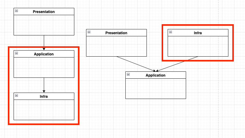 - interface는 application/domain 모듈에 있으므로 infra layer는 필수적으로 application/domain 모듈을 의존해야 합니다