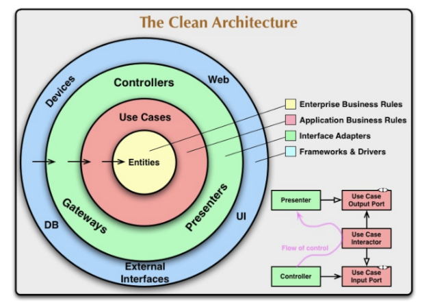 - 데이터 flow는 presentation(세부사항) -> domain(use case/domain) -> infra(세부사항) 이지만, 의존성은 세부사항 -> domain(use case/domain) 로 구성 됩니다